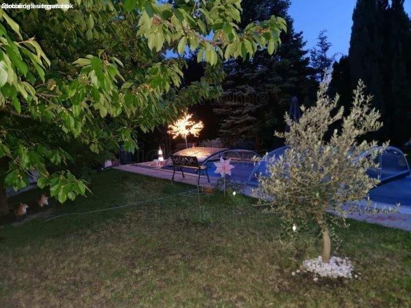 ingatlan gyönyörűen parkosított udvarában egy 8 méter hosszú 2,8 m szélességű
