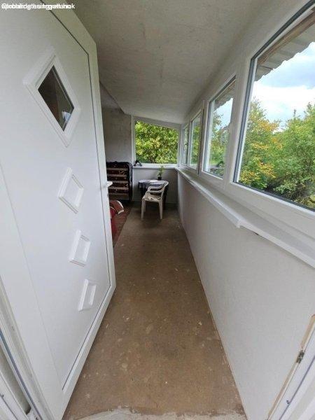 pincébe pár lépcső. A korábbi veranda be lett építve műanyag keretes ablakokkal