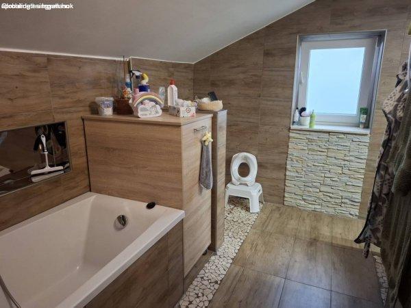 fürdőszoba tusolóval, wc-vel.Az emeletre szép, kényelmes fa lépcső vezet fel.