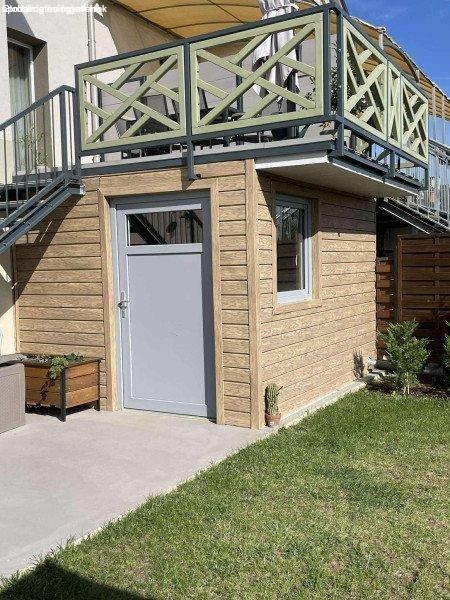 nappali szintjén (15 m˛) és a kerti szinten (15 m˛)hőszigetelt, 12 m˛-es kisház