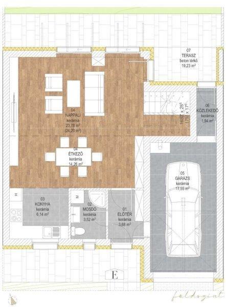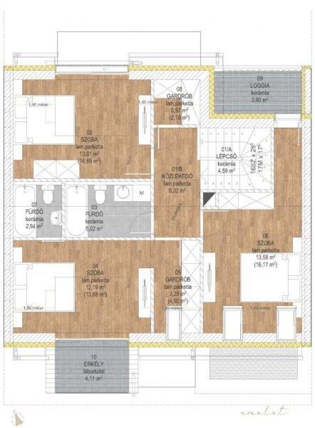 emeleten- 76,12 m2-es saját kert- 17,55 m2-es garázs- Szobák méretei: 13,01 m2,