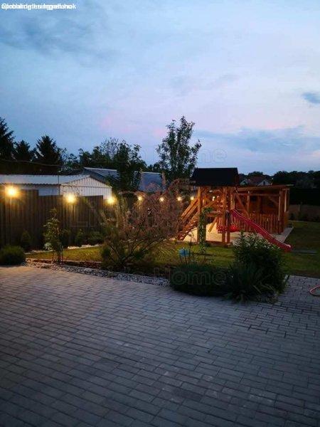 kertben felépült 135 m2 lakótérrel rendelkező kétszintes ház. Fedett teraszról