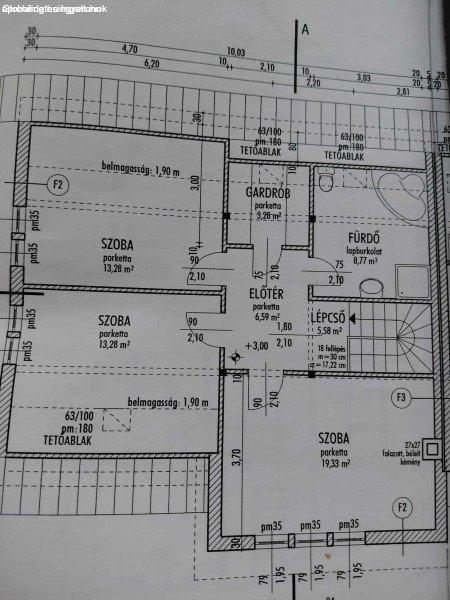 előszoba, kamra, kazánhelyiség, fürdő + WC-emelet (70 m˛): három nagy hálószoba,