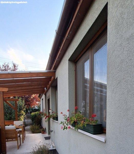 belül gipszkarton álmennyezettel. A bejárat előtt fedett, hangulatos teraszt