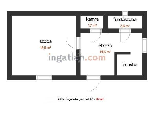 18,5m2, konyha-étkező-előtér 14,6m2, fürdőszoba 2,65m2, kamra 1,7m2;Pince: