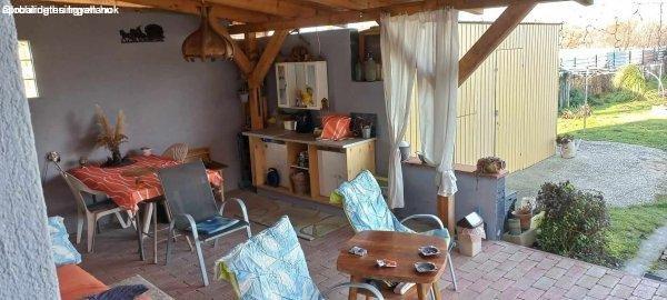 hátsó kertben a hatalmas fedett terasz és a könnyűszerkezetes garázs kapott
