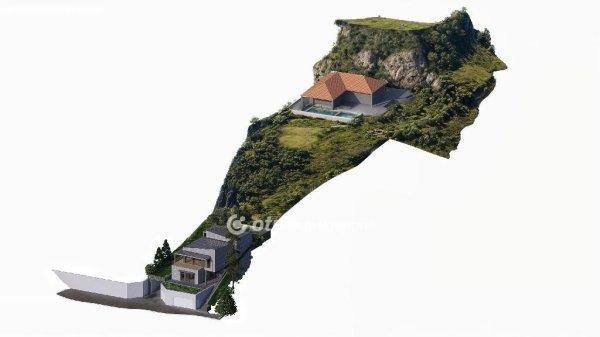 hatalmas teraszokkal simul bele a környezetbe.A telek 810 m2, erősen emelkedik