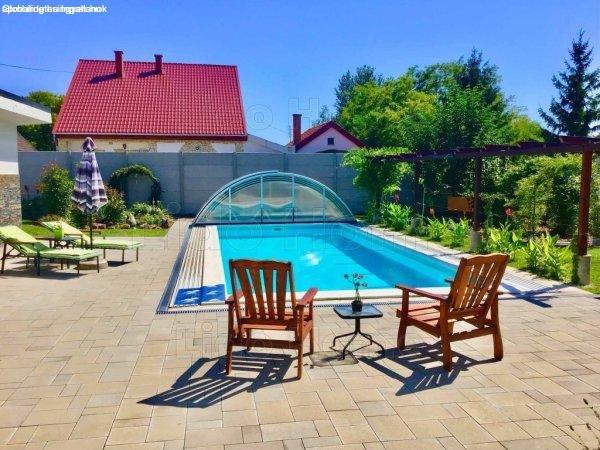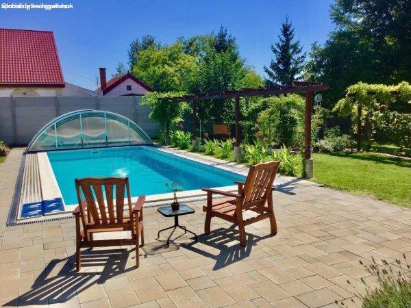 fedett kültéri medencével, dupla garázzsal, vendégházzal, parkosított 1049 m2-es
