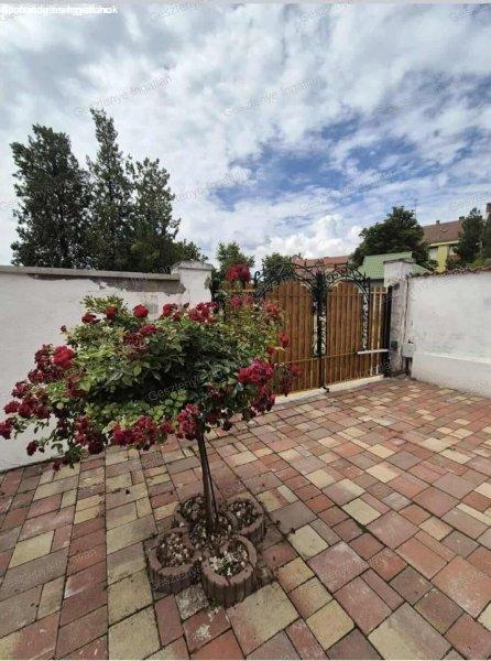 kapuval nyíló bejárattal és kényelmes parkolási lehetőséggel.A kert rendezett,