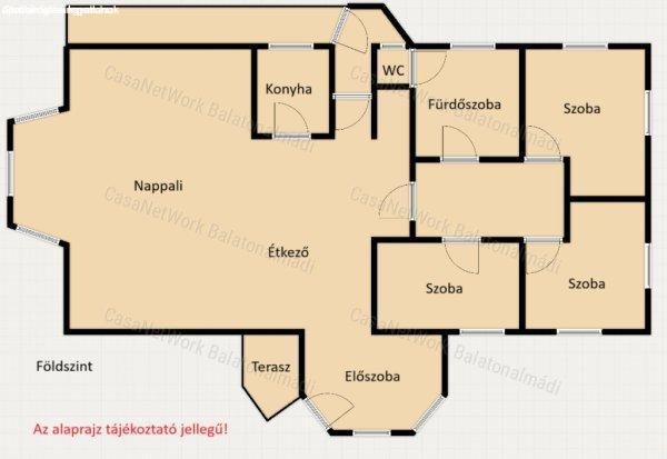 nappali-étkező, konyha, előszoba, három hálószoba, fürdőszoba, toalett és