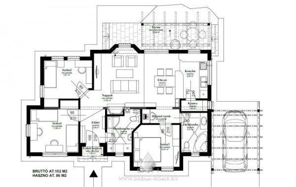 megépített, 85 négyzetméter hasznos alapterülettel rendelkező háromszobás