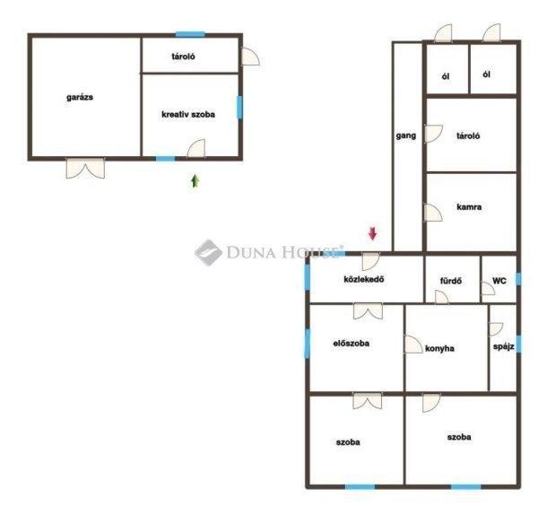 szoba, konyha, előszoba, közlekedő, kamra, fürdő + WC- melléképületben: garázs,