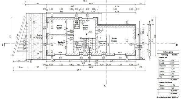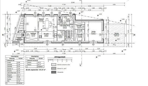 8,19 m2, Lépcsőház-közl. 8,76 m2, Nappali 22,11 m2, Szélfogó 5,00 m2, Szoba