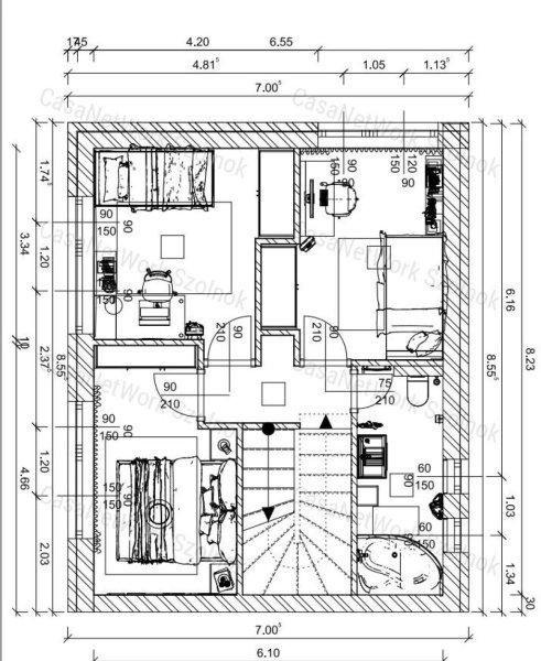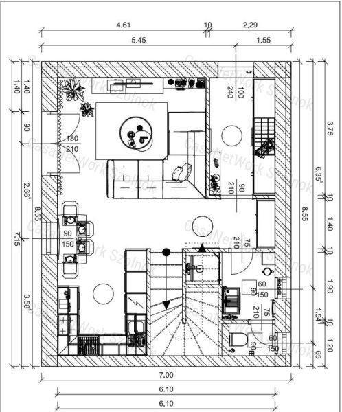 szoba, 2 db fürdőszoba + wc, közlekedő, terasz- belső kétszintes elrendezéssel-