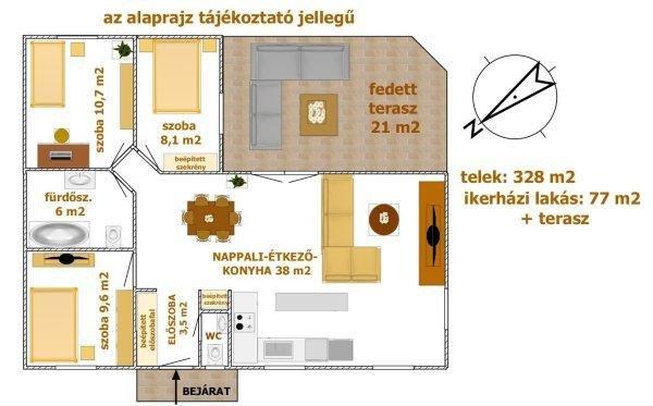 ikerház alapterülete: nettó 77 m2; fedett terasz: 21 m2A ház földszintes