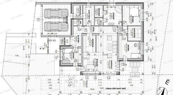gardrób szoba és gépészeti helyiség is található. A fedett terasz körbe öleli a