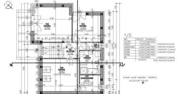 m2), emeletre vezető lépcsőtér 3,3 m2, garázs 17,4 m2, plusz egy 22,5 m2-es