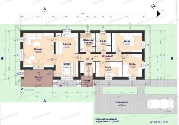 ház 857 nm-es telekre épül, lakóterülete 112.56 nm + 15,85 nm terasz, nappali +