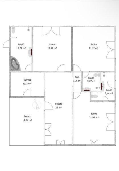 gépesített konyha, 3 nagy méretű szoba (mindegyik saját fürdőszobával) kapott
