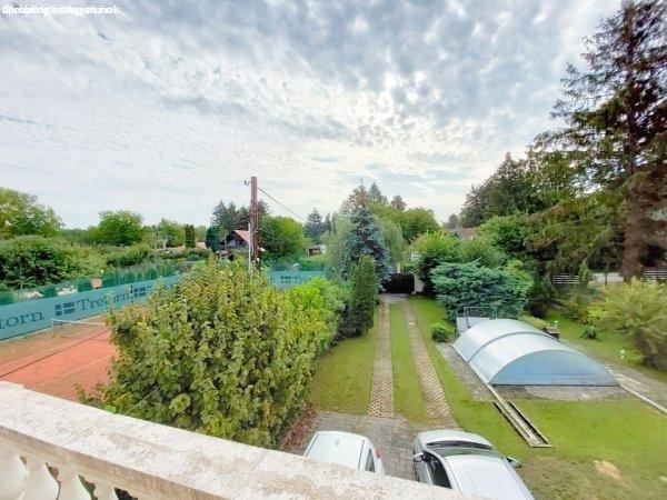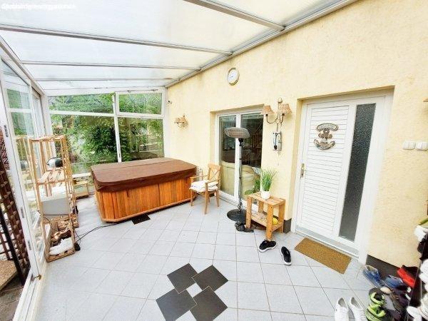 ház dupla garázzsal, kerti medencével, télikerttel, benne jacuzzival. A kert