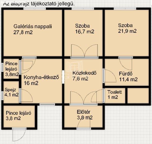 mosókonyhaként használt pince lejárónak, galériás nappalinak, 2 hálónak, egy
