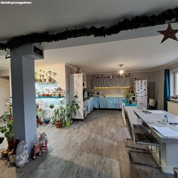 az eladó be fogja fejezni.Az ingatlan lakóterülete 97,4 m2, melyben nappali, 3
