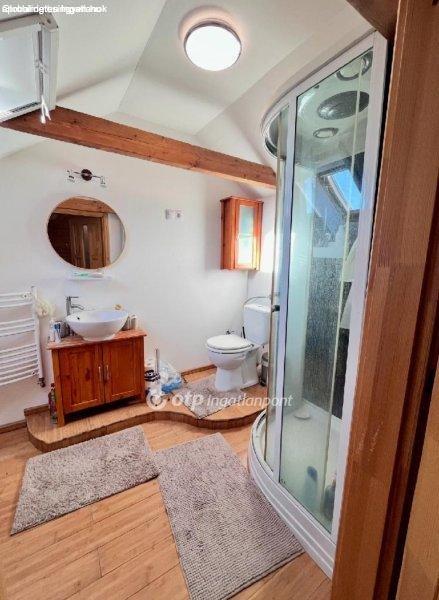 fürdőszoba, külön WC és háztartási helyiség található. A tetőtérben további 2