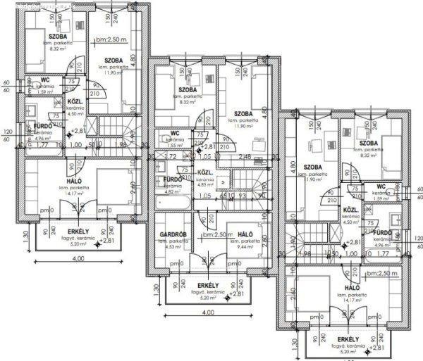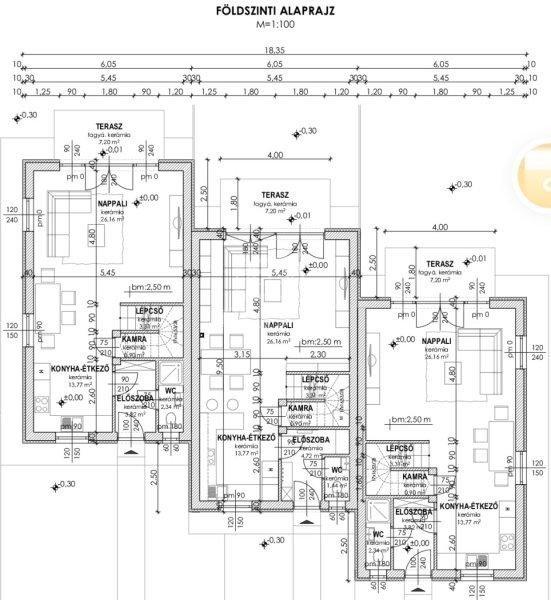 lakás, az épülő sorház két szélén fog elhelyezkedni.Felosztásuk:Földszinten, 50