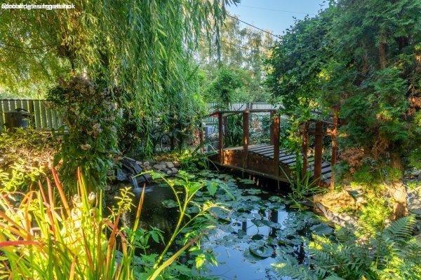 saját halastó híddal, gondozott növényállomány, szalonnasütő és hangulatos