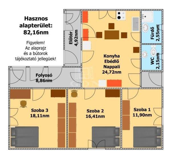 főépület hasznos alapterülete 82,16nm melyben található:- 3 szoba,- 2 előtér,-