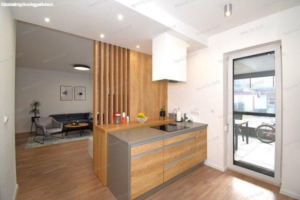 munkapulttal, gránit mosogatóval, beépített gépekkel (indukciós főzőlappal).