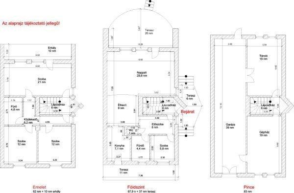 terasz: 20 nm,+ terasz 6 nm,+ terasz 11 nm.Emelet:-lépcsőház: 6nm,-közlekedő:
