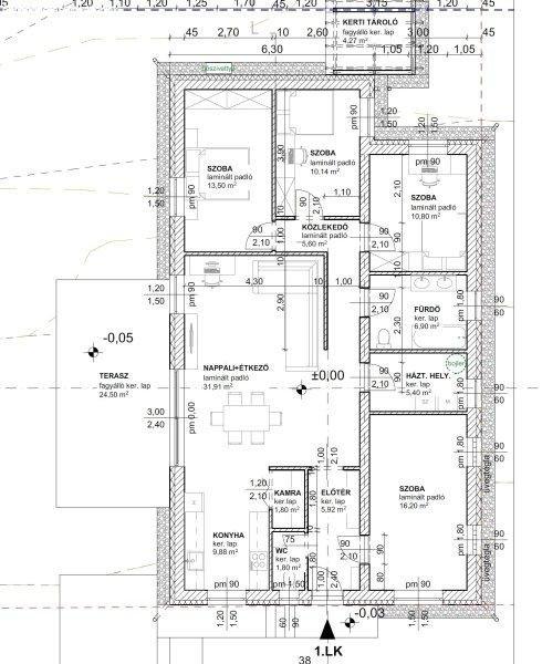 helyiség + 8,91nm terasz + 4,27nm kerti tárolóTelek:- 500nm-es telken