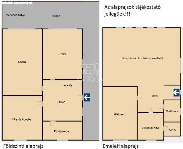 szoba, nagy étkezős konyha, fürdőszoba, lépcső fel - és lejáró, terasz