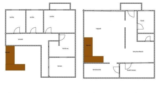 tárolószoba, fedett terasz, tágas nappali és fürdő-WC.Emelet: 3 kényelmes
