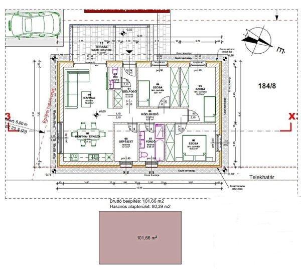 80,39 m2 hasznos alapterületű, bruttó 101,66 m2-es, egyszintes családi ház külön