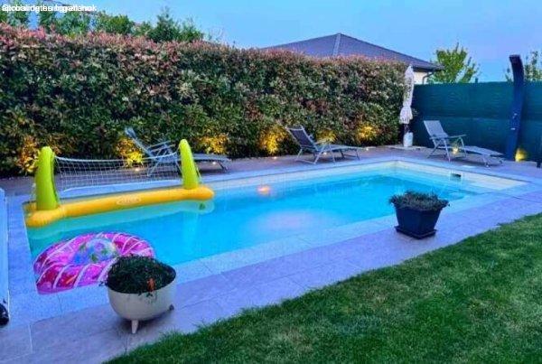 gondozott, élhető kis udvarral, 6x4 méteres fűthető udvari medencével, automata