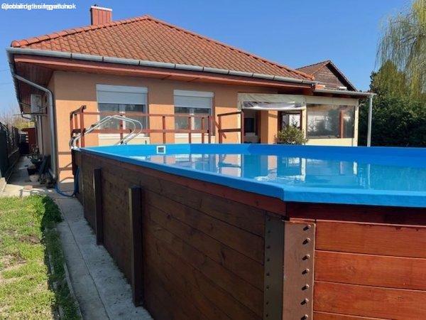 szobás 2 fürdőszobás családiház fűthető úszómedencével eladó.Beton alapon, beton