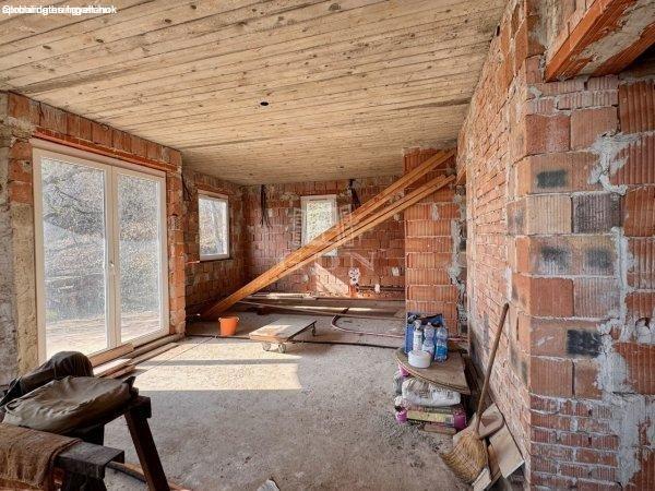 szerkezetkész (kb. 70%-ban) ház található.Az ingatlan jellemzői: 3 lakószint