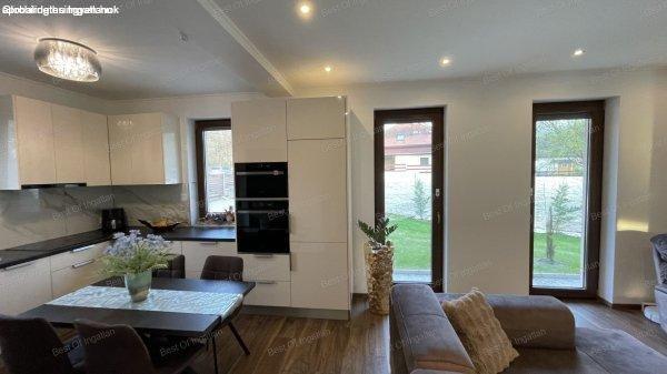 törölközőszárítós fürdőszoba wc-vel.A gépesített, modern, minőségi konyha