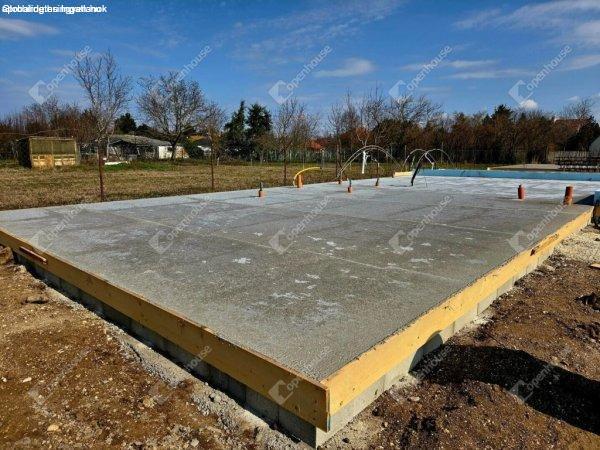készül.Külső kialakítás fedett terasz térkövezett parkoló és járda beton járda a