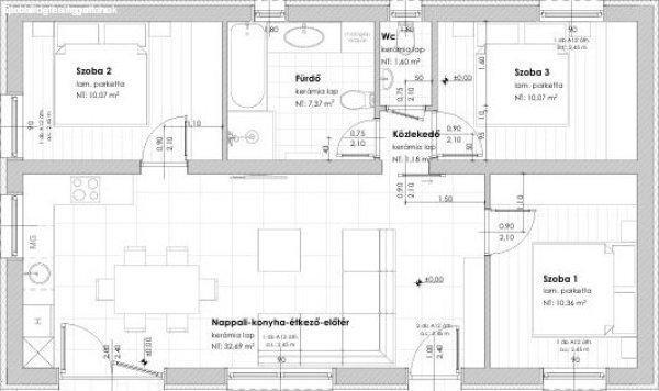 konyha- 3 külön nyíló hálószoba- fürdőszoba káddal és zuhanyzóval- külön WC-