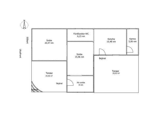 szoba, konyha, kamra, fürdőszoba WC-vel, valamint első és hátsó