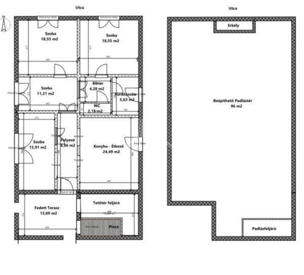 wc, és egy előtér. A fedett terasz 14 nm nagyságú.-tetőtér: beépítetlen, azonban