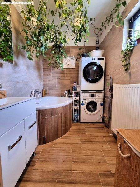 gardrób, sarokkádas fürdőszoba egy helyiségben wc-vel. A nappaliból 38 m2-es