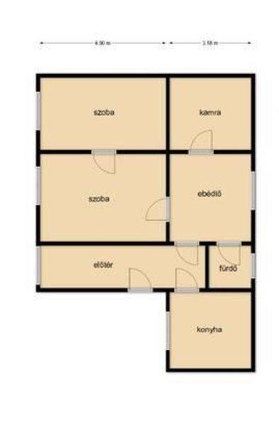 előszoba, konyha, nappali ebédlő egyben, fürdőszoba illemhelyiséggel, 2 szoba és