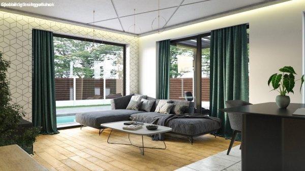 alapterület. Nappali + 3 hálószoba, nagy üvegfelületek, klasszikus formavilág,