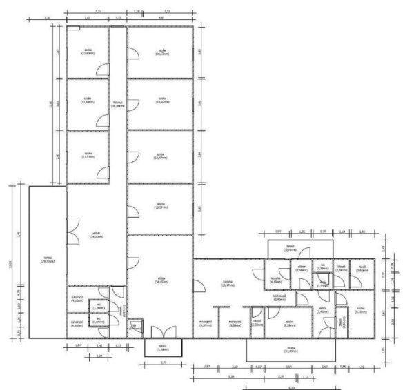 ingatlanban 9 szoba, 2 konyha, 2 zuhanyzó és 1 fürdő, 3 WC, több előtér,