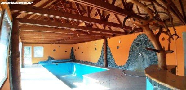 kialakítva medencetér, melynek a mennyezete gyönyörű fagerendás, nyáron az ajtók