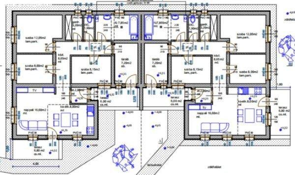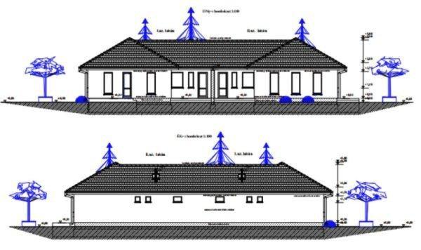 lakásos ikerház hátsó lakását. Az épület belső elosztása: amerikai konyhás